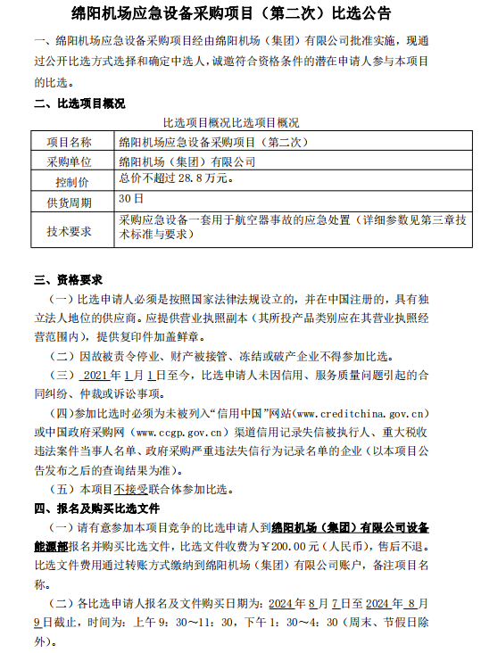 綿陽(yáng)機(jī)場(chǎng)應(yīng)急設(shè)備采購(gòu)項(xiàng)目(第二次)比選公告