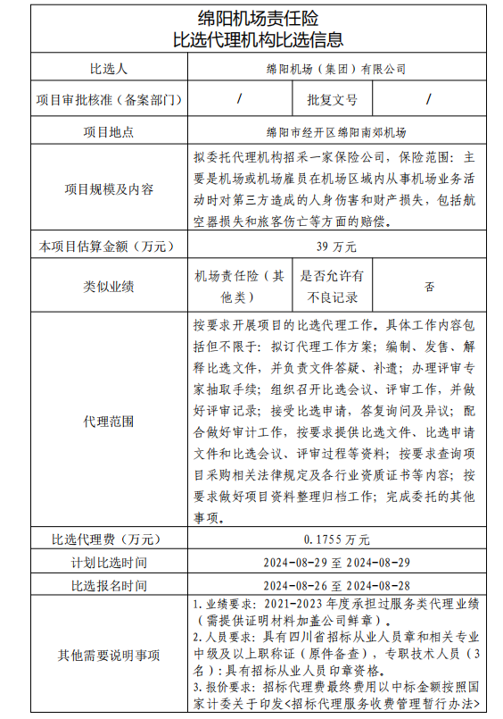 綿陽機(jī)場責(zé)任險(xiǎn) 比選代理機(jī)構(gòu)比選信息